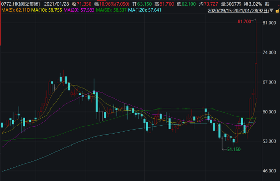 在沉寂许久以后,腾讯旗下的网文巨头阅文集团今天股价出现大涨,盘中一度涨超20%,盘中最高涨至81.7港元,引发市场关注。