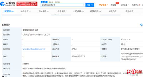 天眼查APP显示,碧桂园主要从事销售物业业务。该公司成立于2006年11月10日,注册地址在开曼群岛,其办公地址在广东省佛山市。
