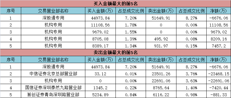 盘后龙虎榜数据显示,当日,歌尔股份被深股通卖出5.16亿元并买入4.49亿元,合计净卖出6676亿元;此外,中信证券北京总部卖出2.35亿元;另有4家机构合计买入3.79亿元,一家机构卖出2.27亿元