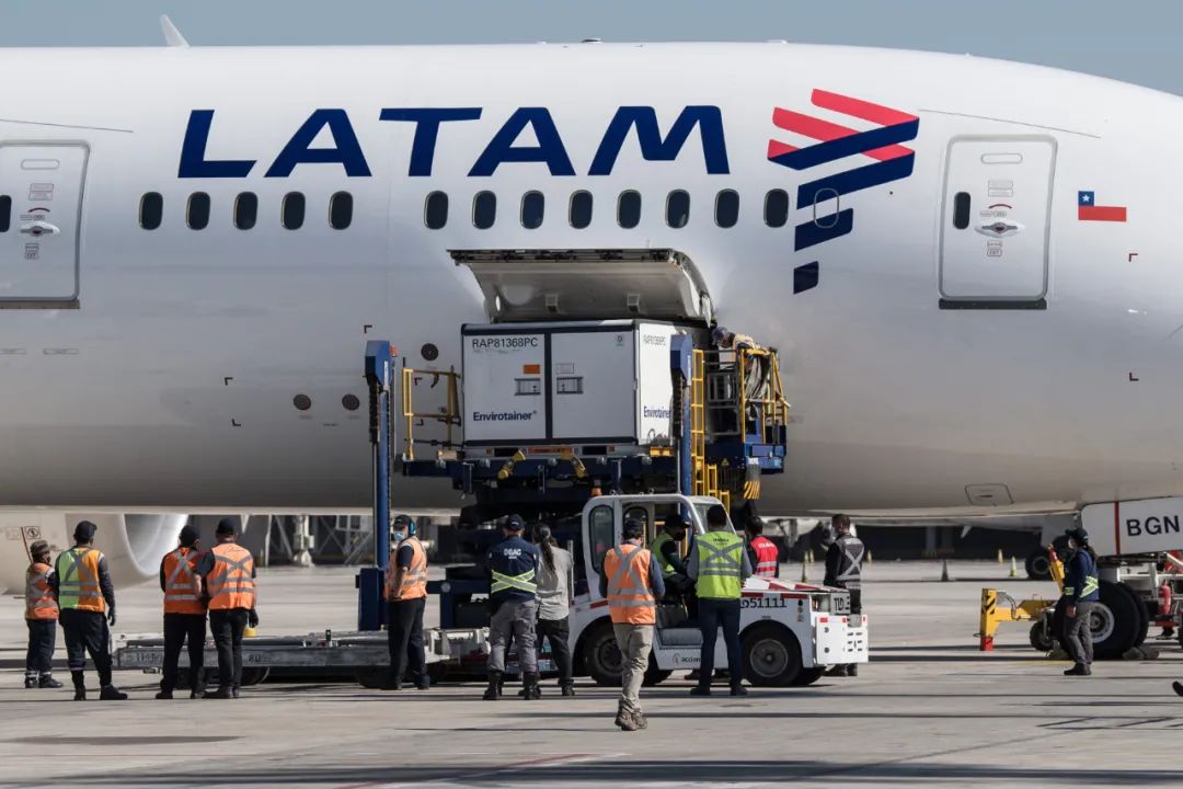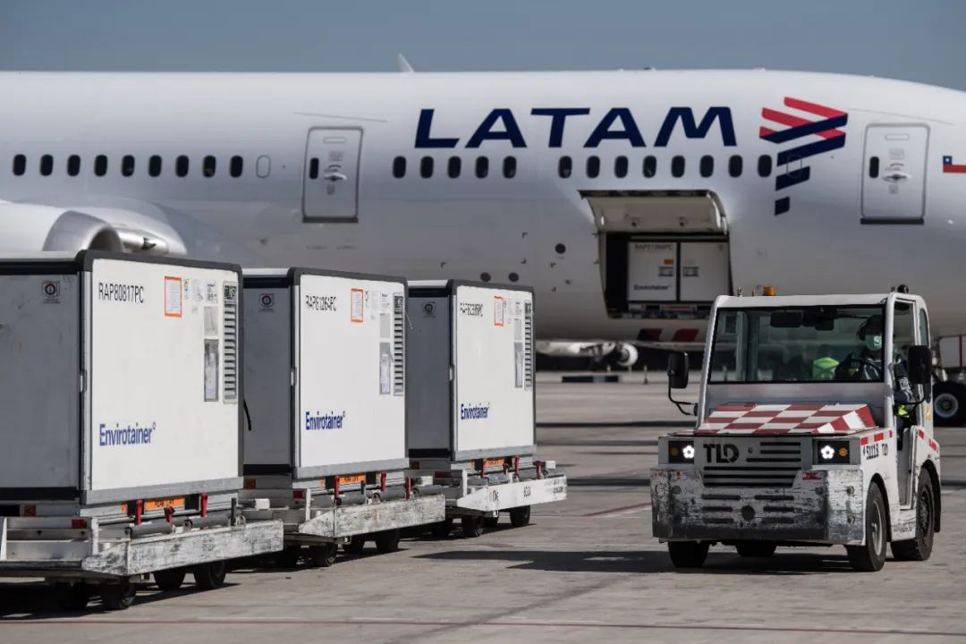 1月28日,在智利圣地亚哥国际机场,工作人员从飞机上卸下装有首批来自中国生产的新冠疫苗的温控集装箱。