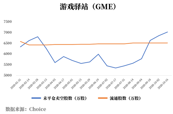 2020年大部分时间,GME的空头持仓规模都接近所有流通股,并且2021年以来被机构做空的股票数量相对流通股数达到140%的水平。