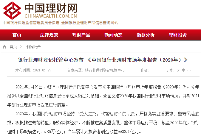 1月29日,银行业理财登记托管中心发布《中国银行(维权)业理财市场年度报告(2020年)》。《报告》以全国银行业理财信息登记系统大数据为基础,全面总结2020年我国银行业理财市场情况,并对2021年银行业理财市场发展进行展望。