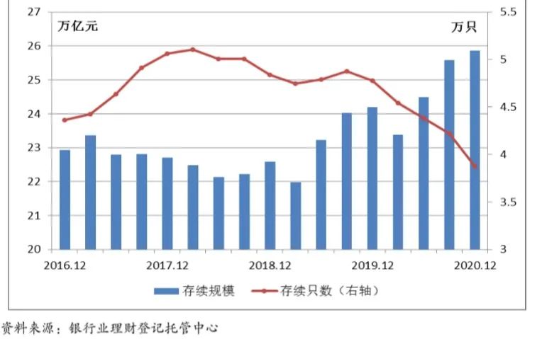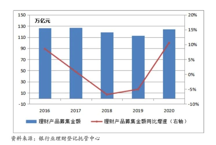数据显示,2020年,理财产品全年累计募集金额124.56万亿元,同比增长10.59%;理财产品存续规模25.86万亿元,同比增长6.9%。
