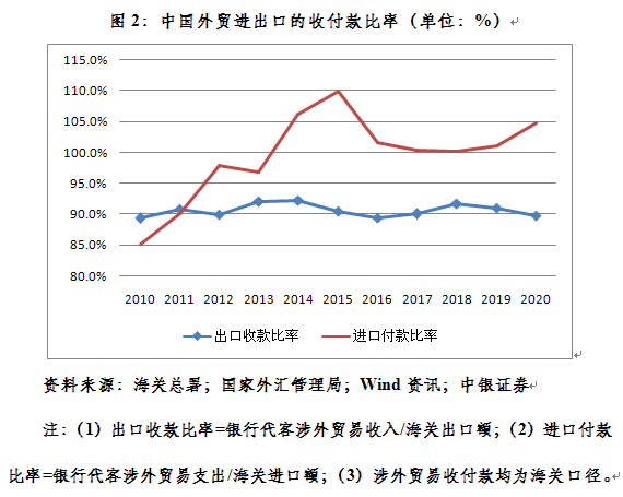 2010年以来,中国企业出口收入长期低于海关出口额(即出口少收款),出口收款比率维持在90%左右。去年,该比率为89.7%,较上年低了1.3个百分点。2013年以前,中国企业进口付款低于海关进口额,但2014年之后开始大过海关进口额(即进口多付款),企业进口付款比率持续高于100%。去年,该比率为104.7%,较上年高出3.6个百分点(见图2)。