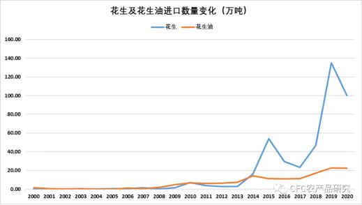 如图所示,世纪初的十年,国内基本能实现花生自给自足,而最近5年进口数量出现了飙升。飙升的来源就是国内油料花生供需失衡带来的缺口。