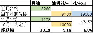 即使是按照豆油和花生油11000的高价差来算,花生油10月定价预估为11000(价差)+7178(豆油)=18178(花生油),其远月价格照目前市场价亦跌去6.8%,同样和油料花生的远月上涨形成反差。