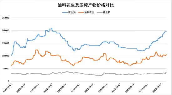 与出粕率79%,豆粕作为主要终端收入的大豆压榨不同,花生的出粕率只有55%,而出油率高达43%。以当前的油粕价格进行计算,花生油占压榨终端产品总价值的比例超过8成,是主要的压榨利润来源。我们从三者间的价格走势也能确认这一点,在过去的十多年里,可以清晰的看到油料花生和花生油价格之间呈现明显的正相关,而花生粕的价格则并不随上游波动,基本保持稳定。
