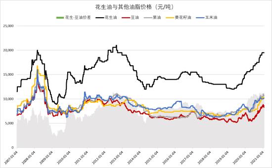 观察上述价值链传导中所提及的花生油-豆油价差,可以发现花生油与油脂代表-豆油的价差已经拉大到了11000,超出了5000-10000的价差常规区间。虽然这一定上可以反映出疫情之下居家做饭人们的消费偏好,但十分反常的高价差也能体现目前花生价格的过高,未来走缩才是大概率事件。