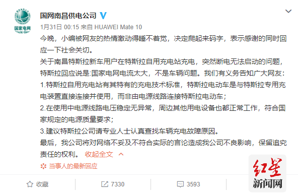 1月31日凌晨,针对该事件,国网南昌供电公司发布声明称:特斯拉自用充电站有其特有的充电技术标准,特斯拉电动车是与特斯拉专用充电装置直接连接并使用,而非由电源线路连接特斯拉电动车;在使用中电源线路电压稳定无异常,周边其他用电设备也都正常工作,符合国家规定的电源质量要求;建议特斯拉公司请专业人士认真查找车辆充电故障原因。我公司将对网络不妥及不符合实际的言论造成我公司不良影响,保留追究责任的权利。