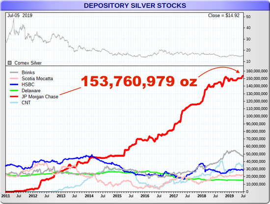 截至2019年7月底,摩根大通持有COMEX白银现货库存高达约1.5亿金盎司(约4782吨),约占COMEX交易所总库存9659吨的一半!在任何大宗商品交易市场,任何一家机构持有总库存50%都会让人浮想联翩,更何况历史上曾出现过几次大佬操纵白银的案例。
