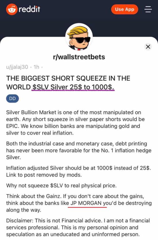 上周WSB几乎全是硬杠游戏驿站的帖子,突然冒出来一个我们去买白银吧!“因为我听说它现在是全球市场被严重操纵的品种,现在全球放水,按理说白银价格应该大涨,为什么现在才20美元,应该涨到1000美元,我们推高白银价格,就可以让一直做空的摩根大通这样的大行破产”。