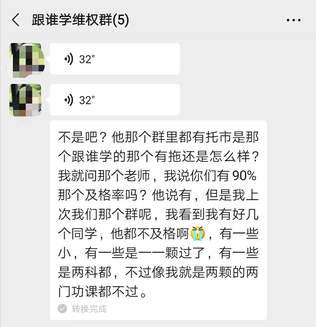 还有多名学员对跟谁学客服人员所承诺的高通过率真实性也存疑。根据群里多个学员的说法,他们在学习完课程后依然没有通过考试,押题也完全没有宣传中的那样精准,“一道题也没押中”。