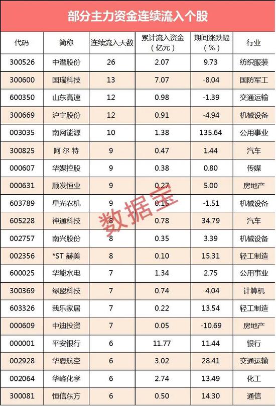从股价表现看,主力资金连续流入期间,上涨的个股共有46只,涨幅居前的有南网能源、神通科技、华夏航空等,涨幅分别为135.64%、34.79%、28.41%。跌幅居前的有中迪投资、创新医疗、九典制药,跌幅分别为10.69%、10.12%、8.79%。资金连续流入股期间股价表现与沪指相比,强于大盘的有53只。