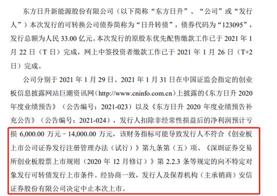 东方日升公告称,由于扣除非经常性损益后的净利润预计亏损,公司决定中止其可转债上市。公司此前发行的可转债简称为“日升转债”,代码“123095”,发行总额为33亿元。原股东优先配售及网上中签者缴款工作已分别于1月22日、26日完成。证券时报记者查阅资料发现,这也是A股历史上首个发行可转债募资结束但中止挂牌上市的案例。