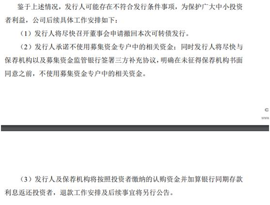 对于可转债中止上市后的具体安排,公司也公告了相应办法:公司将尽快召开董事会申请撤回本次可转债发行。同时,公司承诺不使用募集资金专户中的相关资金。随后,公司及保荐机构将按照投资者缴纳的认购资金并加算银行同期存款 利息返还投资者,退款工作安排及后续事宜将另行公告。