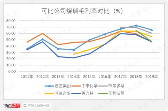 对比可以看出,君正集团聚氯乙烯、烧碱两大产品的毛利率,在刚上市的前几年并没有特别明显的优势,但最近几年开始逐渐赶超竞争对手。
