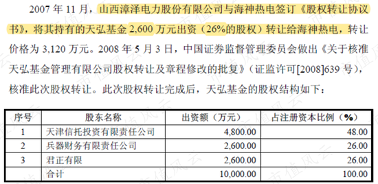 2007年11月,山西漳泽电力将其持有的天弘基金26%股权,以3,120.00万元的对价,转让给了海神热电(君正集团前身),经历后续增资后持股比例降至15.60%。