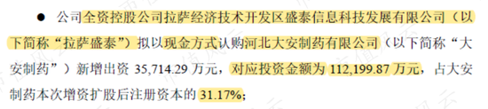 2020年2月,上市公司公告称,全资子公司拉萨盛泰拟认购大安制药31.17%股份,投资金额为11.22亿元,方式还是现金。