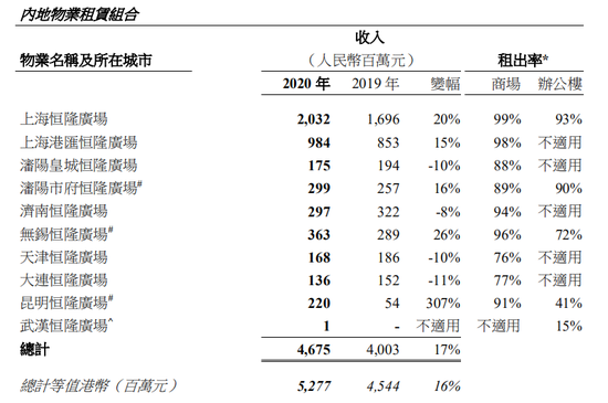目前,恒隆在内地共有9个项目,其中5个五星级商场,包括上海的两个项目,还有无锡、昆明、沈阳的市府广场,其中5个五星级商场在2020年都实现了增长,而其他4个四星级商场的收入全部下降。由此看来,该数据与恒隆解释物业估值下降的说法相契合。