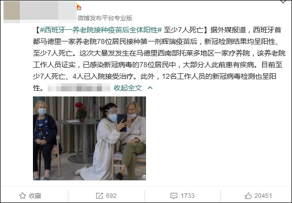 原标题:西班牙一养老院接种疫苗后全体阳性?辉瑞真摊上事了?