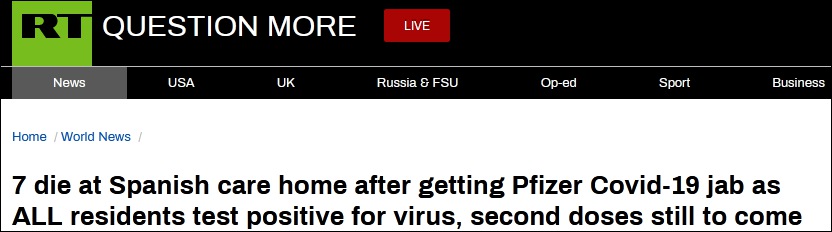 西班牙《先锋报》网站刊载了埃菲社的这篇报道“今日俄罗斯”也对此进行了报道,并在标题中写明疫情是在疫苗注射后发生的。不过该电视台还在标题中指出了另一点——第二剂接种尚未开始: