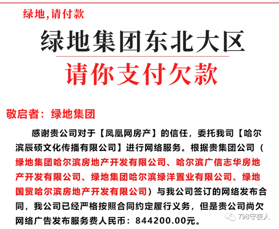 2月2日晚间,消息,安居客哈尔滨站、乐居哈尔滨站、哈尔滨房天下、凤凰房产、新浪黑龙江等多家媒体共同发布一则《绿地集团东北大区,请支付您的欠款》的消息。值得注意的是,此前绿地集团曾经欠: