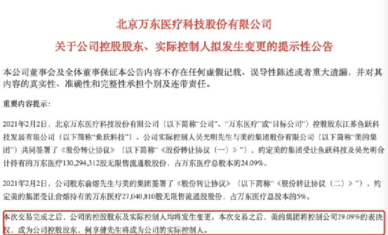 2月2日晚间,万东医疗公告表示,美的集团将以每股14.60元价格合计受让公司29.09%股份,交易金额22.97亿元,本次交易完成后,美的集团将成为公司控股股东,公司的实际控制人由吴光明变更为何享健。