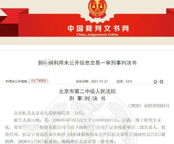 1月21日,中国裁判文书网公布的一份刑事判决书显示,郭某纲因犯利用未公开信息交易罪,被判处有期徒刑一年六个月,并处10万元罚金。透视其违法行为,正是业内俗称的“老鼠仓”。