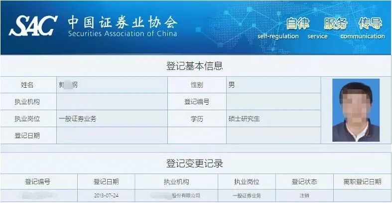 具体来看,在2013年至2018年间,郭某纲担任华北某券商证券投资部项目二部负责人、投资经理,负责该公司自营证券账户的投资决策。中证协信息显示,郭某纲于2013年7月在该券商办理执业登记,目前其登记状态已为“注销”。
