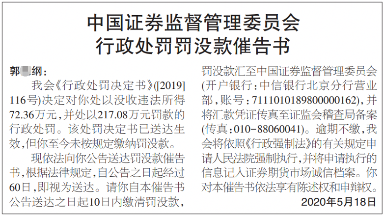 值得一提的是,在行政处罚落地后,郭某纲并未及时缴纳罚款。对此,证监会曾发出罚没款催告书,但经催告后仍未履行。证监会遂向北京市西城区法院申请强制执行,并在2020年8月获得法院裁定准予。