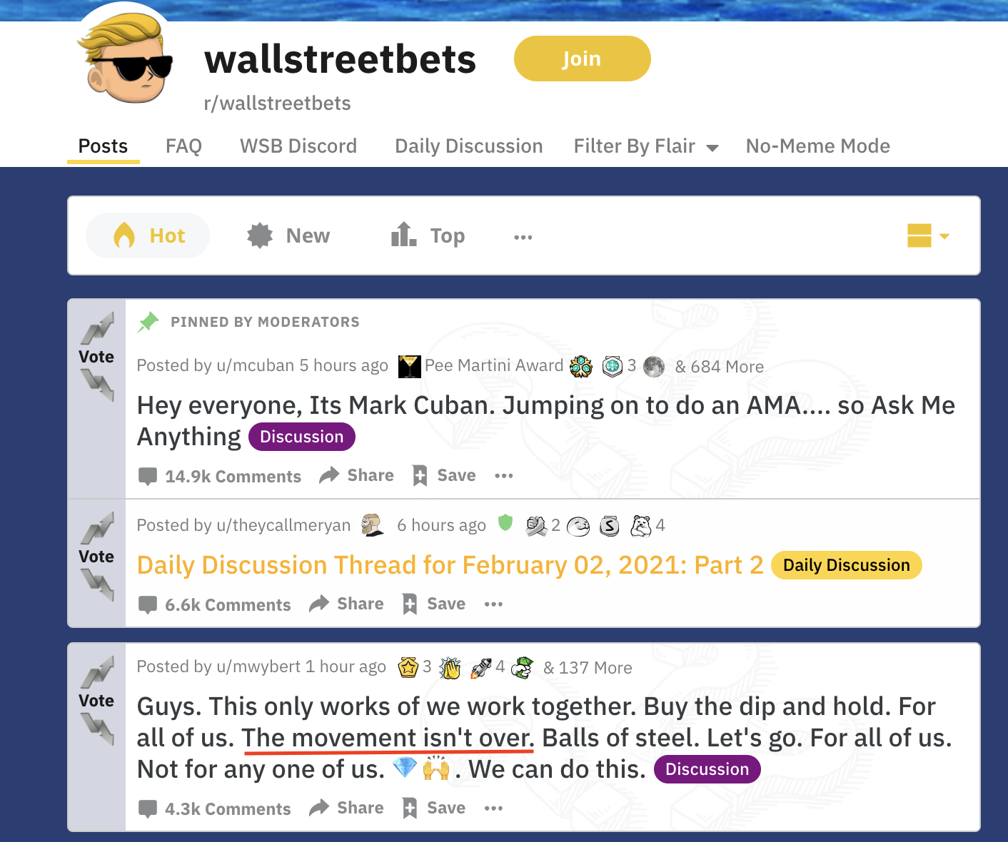 在散户大本营—Reddit论坛的WallStreetBets板块—有网友发帖,呼吁散户团结一心、趁低买入、长线持有。该帖子写道,“The movement isn’t over”,此役尚未结束。纽交所交易员塔奇曼(Peter Tuchman)告诉第一财经记者,“你根本不知道是谁在发表评论,是空方还是多头,有没有持仓相关股票,有没有趁低买入,太多不确定性。”他指出,WSB概念股是非常危险的战场,投资者如若没有丰富的交易经验,很难全身而退。“美股市场上有上千只个股,为什么不选择那些赚钱概率高于亏钱的股票呢?”