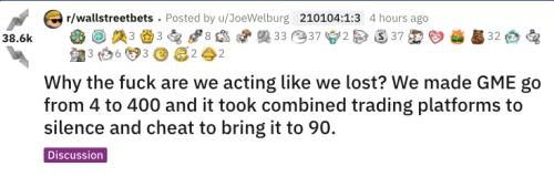 “为什么我们表现得像输了一样?我们已经让游戏驿站从4美元涨到了400美元。是交易平台的集体沉默和弄虚作假才让股价跌至90。”