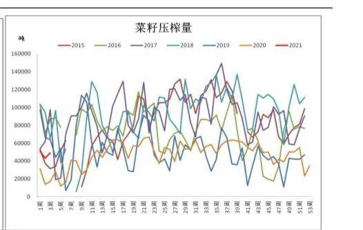 菜油近来疲惫不堪的走势,一来受到整体农产品板块下跌的拖累,二来和自身当下内在逻辑也紧密相关。就现阶段供应侧分析,据最近数据显示,截至2021年第3周,(1月16日-1月22日)沿海油厂开机率明显回升,全国纳入调查的101家油厂菜籽压榨量在 49000吨,较上周 43000 吨增加 6000吨,增幅 13.95%,其中进口菜籽压榨49000吨(出粕26950吨,出油 21070 吨),本周菜籽压榨开机率(产能利用率)9.78%,上周开机率在 8.58%,压榨小幅上涨。其中本周国产菜籽开机率较上周持稳在 0%,基本持平;沿海地区进口菜籽加工厂开机率在 23.73%,上周开机率在20.82%,增加2.91%。截至1月结束,随着油厂恢复开机,压榨量均重新回升至 6.65万吨左右,短期供应压力有所增加。