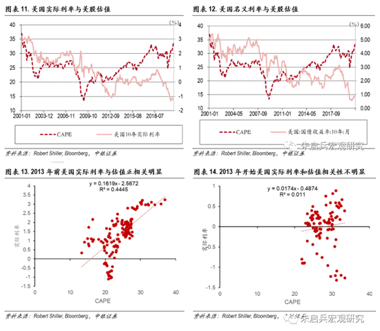 利率和股价/估值之间直接的负相关更多体现在中枢水平而非短期波动上。在较长的时间维度可以观察到较高的利率中枢往往对应较低的估值中枢,反之亦然。比如说80年代以来长端利率的下降趋势对应CAPE的上行趋势,以及金融危机前较高的利率中枢(与金融危机后对比)对应较低的估值中枢等。估值水平的短期波动或更多由交易行为主导,因此可以看到估值与债券收益率之间的正相关性。