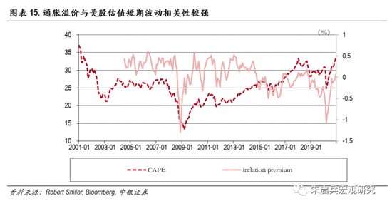 在短期波动中,实际利率与估值的负相关关系可以从“实际利率相对增速与估值负相关”去理解。当前不断上行的通胀溢价正为美股估值提供支撑。