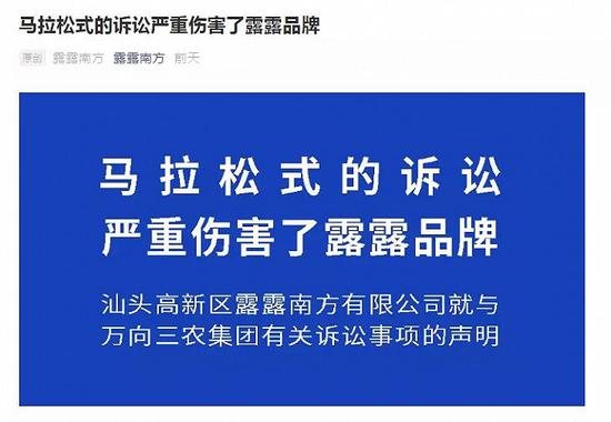 2月1日,汕头高新区露露南方有限公司(下称“汕头露露”)通过官方公众号就其与河北承德露露股份有限公司(以下简称“承德露露”)之间一则诉讼判决发表声明。