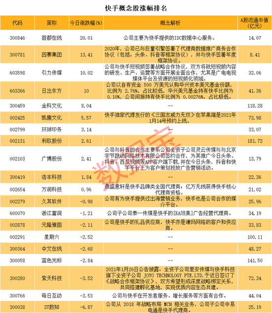 快手飙涨之下,A股的小伙伴也大幅上涨。截至收盘,首都在线、引力传媒、日出东方等快手概念集体涨停。其中,首都在线20%涨停。另外,因赛集团涨超13%,金科文化、凯撒文化等个股均涨逾5%。