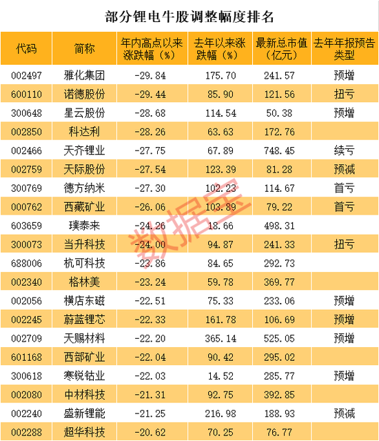 “锂王”大跌不仅仅是锂电池板块的个股,近期板块整体调整幅度也不小。就今天而言,除了天齐锂业,科士达、盛新锂能、石大胜华等个股也封上跌停板。短期持续大幅上涨,其波动也必然加剧。除了天齐锂业外,雅化集团、诺德股份、星云股份等众多锂电牛股回调超20%。