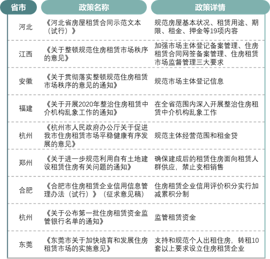 在2020年地方关于长租市场发布的各项政策中,占比最大的就是市场规范类的政策。据不完全统计,市场规范类的政策在全部政策中的占比接近4成。长租公寓的市场发展还处于早期的阶段,市场比较混乱,今年长租企业频频“爆雷”,更加凸显出仅依靠市场本身难以稳健发展的问题。房源和合同不做备案,存在诸多虚假信息,扰乱市场秩序。经营者本身资质存在问题,一旦经营出现不利状况就人去楼空。扩盘子、抢市场,许多企业为了规模采用“高收低租”的高风险经营方式。玩资本游戏,“长收短付”、违规使用“租金贷”的现象已经成了标准玩法。还有其他的诸多问题,都让这个市场的生长偏离了正常的经营逻辑。因此,规范市场的政策不断出台,稳住市场的运行秩序,避免市场走向不可控制的境地。