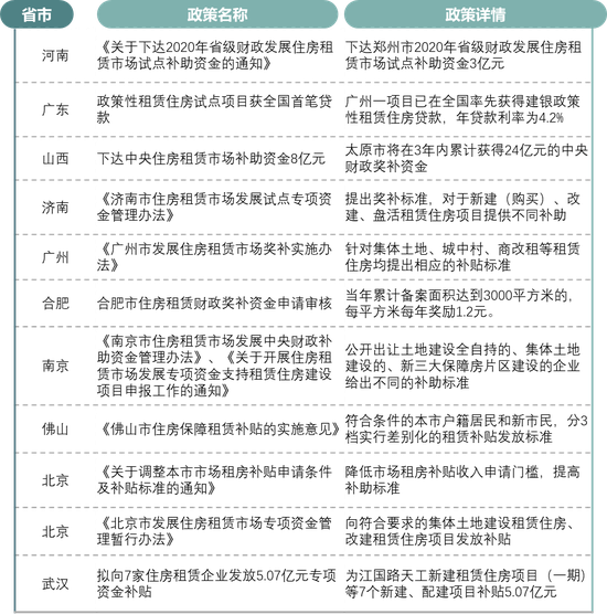 为了扶持租赁市场的发展,2020年多地政府发布了补助的相关政策或进行了实际的补助。绝大部分补助采用的是直接补助的形式,也有如广东通过政策性贷款在融资的利率上提供补助的方式。接受补助的对象大部分是运作租赁住房项目的企业,而北京和佛山则对符合条件的租户提供了资金补助。补助可以通过以下三方面促进住房租赁市场的发展:其一,通过直接的补助来提升企业的盈利水平,减轻租户的租金压力来提振需求;其二,发放补助也可以给市场一个向好的预期,政策面是真金白银地支持租赁市场的发育的;其三,通过在补助条件上设置一系列的标准引导企业的经营行为,有助于建立起长效化的住房租赁市场运作机制。