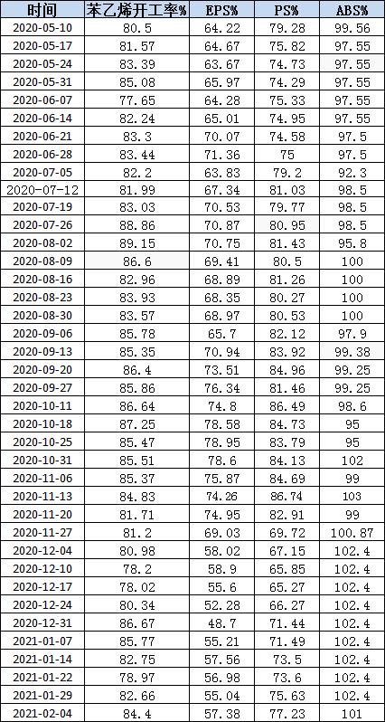 随着苯乙烯利润的走高及检修装置复产,苯乙烯工厂开工率较上周有所提高。三大下游EPS、PS环比小幅走升,反倒是前几个月十分稳定的ABS开工率出现下滑,因山东海江一条线装置故障检修,开工负荷降至7成,导致行业开工率小幅下降。