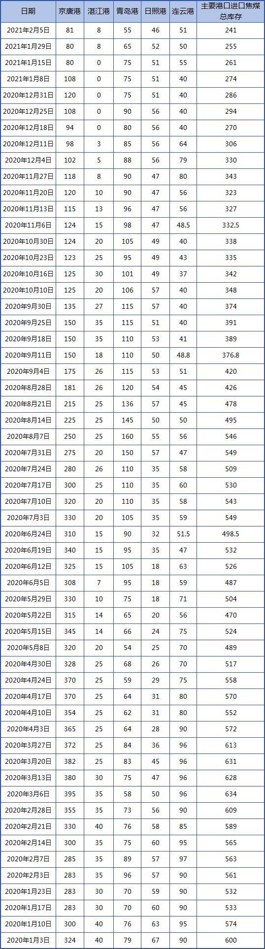 以下为2020年1月以来中国主要港口进口焦煤库存:(单位:万吨)