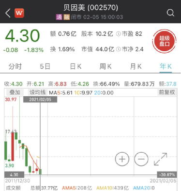 今日盘中,贝因美股价高开后一路震荡走低,截至收盘,跌1.83%,报收4.3元/股。开年迄今,股价累计跌幅超30%。