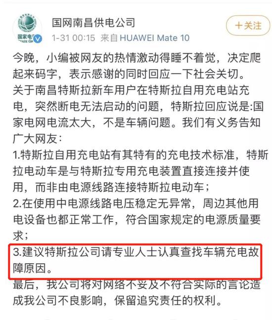 对于特斯拉售后人员指国家电网电流太大致车辆损毁的说法,1月31日凌晨,国网南昌供电公司深夜回应:“建议特斯拉公司请专业人士认真查找车辆充电故障原因。”