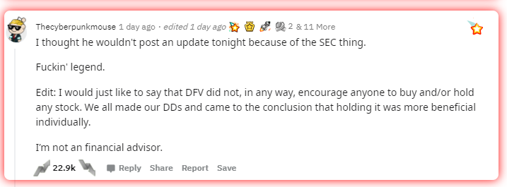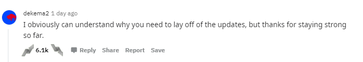 随后有不少WSB用户在底下留言评论,猜测“大哥”是否已在GME股价接连几日重挫之后脚底抹油,另有高赞回复打起了谜语:我很理解你为什么停止更新,但谢谢你到目前为止一直十分坚强。