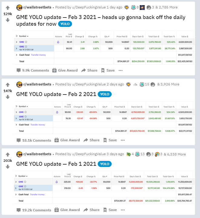 他的最新一篇帖子停留在2月3日,当时他表示将暂停对持仓情况进行每日更新。周三过后,他投资GME股票和期权的合计收益突破785万美元,累计收益超过1040%。