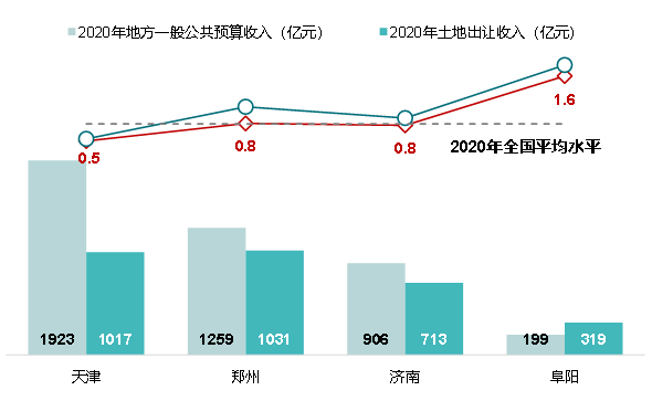 结合与地方一般公共预算收入的对比来看,2020年,天津、郑州、济南、阜阳土地出让金收入与地方一般公共预算收入的比值均较2019年水平有所下降。
