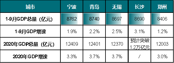 各地统计局最新数据显示,2020年宁波、青岛、无锡、郑州GDP规模均在1.2万亿元以上,其中青岛超过无锡,经济总量排名全国第13位;而长沙尚未公布全年确切数据,长沙、郑州的排名变化仍存在一定的悬念,但结合前三季度的经济情况来看,长沙复苏势头较好,且“十四五”规划建议中也提及预计2020经济总量将突破1.2万亿,故而GDP排名大概率将超过郑州进阶15强。