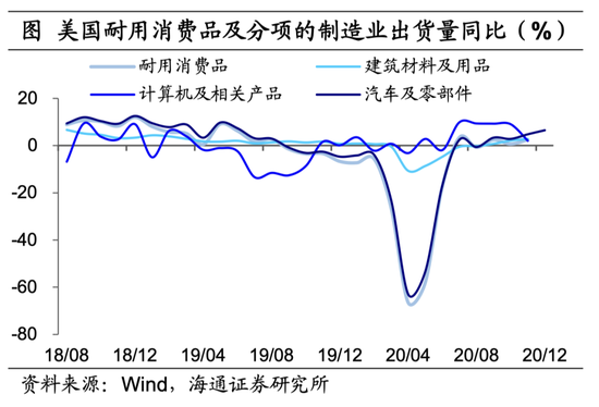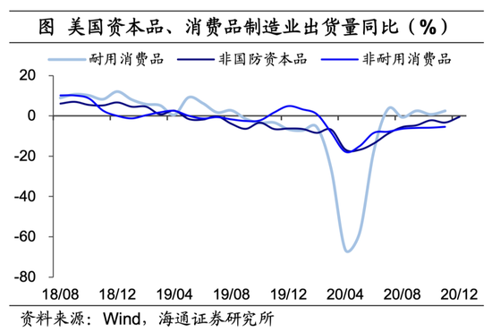 如果分行业看,部分产品制造更是超越了疫情前的水平。受较强的需求拉动,美国耐用消费品的出货量增速普遍在三季度实现转正,尤其是计算机及相关产品的出货同比从20年7月以来连续位于9%以上的高位,汽车及零部件出货也在12月升至6.5%。相比之下,剩余的非耐用消费品、资本品生产恢复稍显落后,但也都在持续回升的过程中。