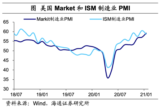 从产能利用率看,美国的工业产能已恢复了接近九五成。去年5月份开始,美国的生产就进入了持续的修复状态,截至12月,工业产能利用率已回升至74.5%,为19年同期的大约96%,其中制造业产能利用率已接近上一年同期的98%。领先指标PMI也显示,进入1月后美国的制造业景气度仍保持在高位水平,生产端恢复有望延续。
